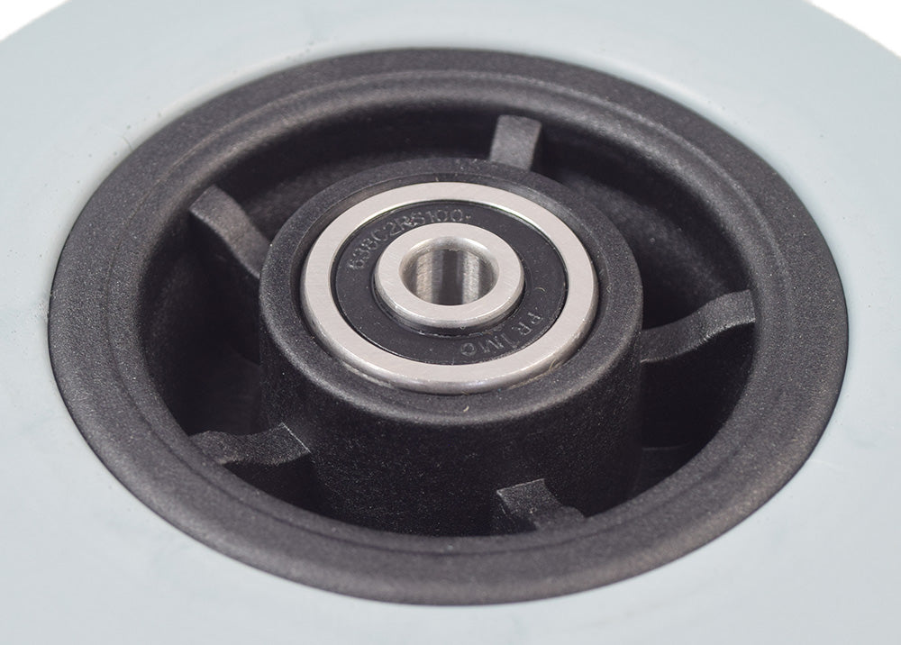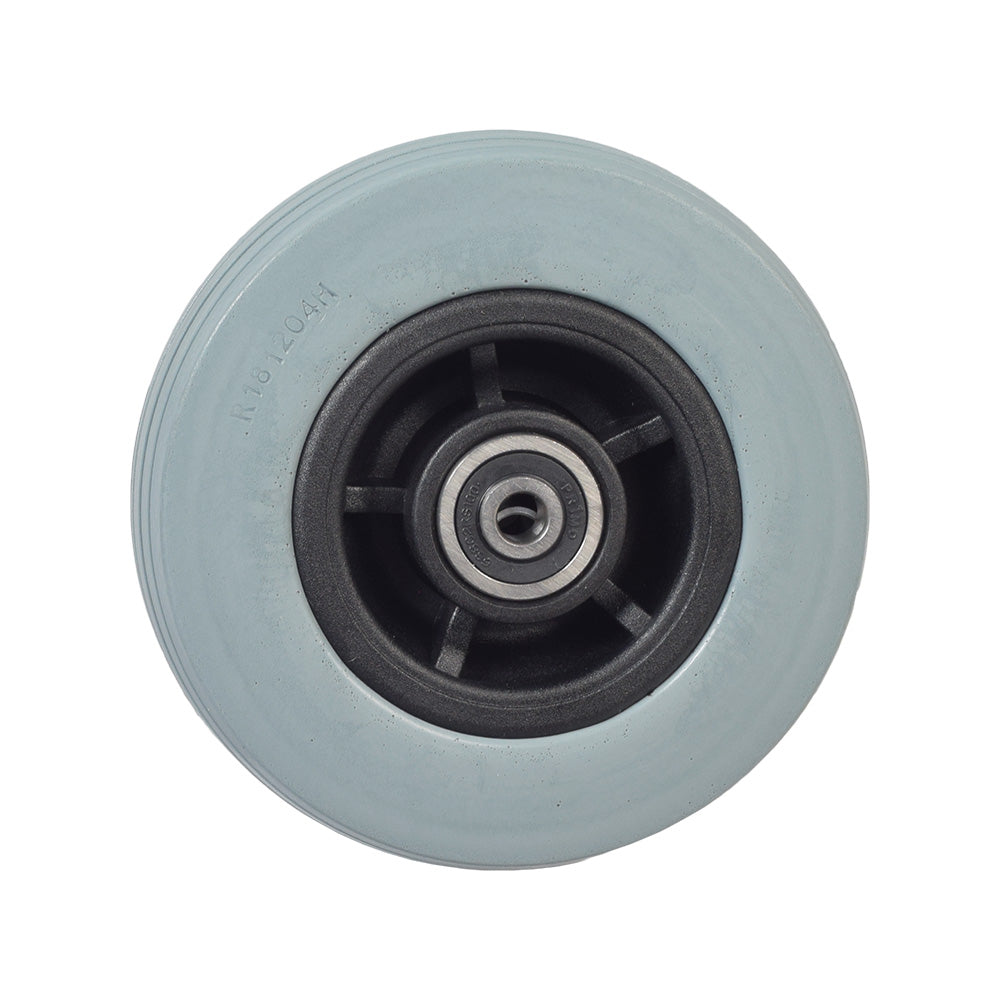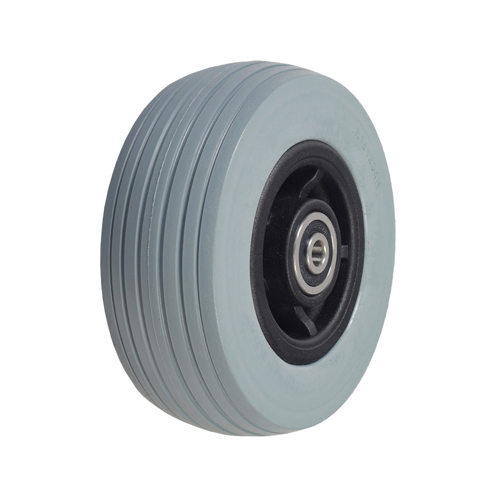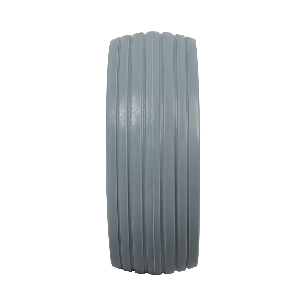 Flat free front caster wheel assembly for the Jazzy 600 power chair. This assembly includes a 5" x 1.75" gray tire with black rim, wheel bearings, and spacers (not shown).
