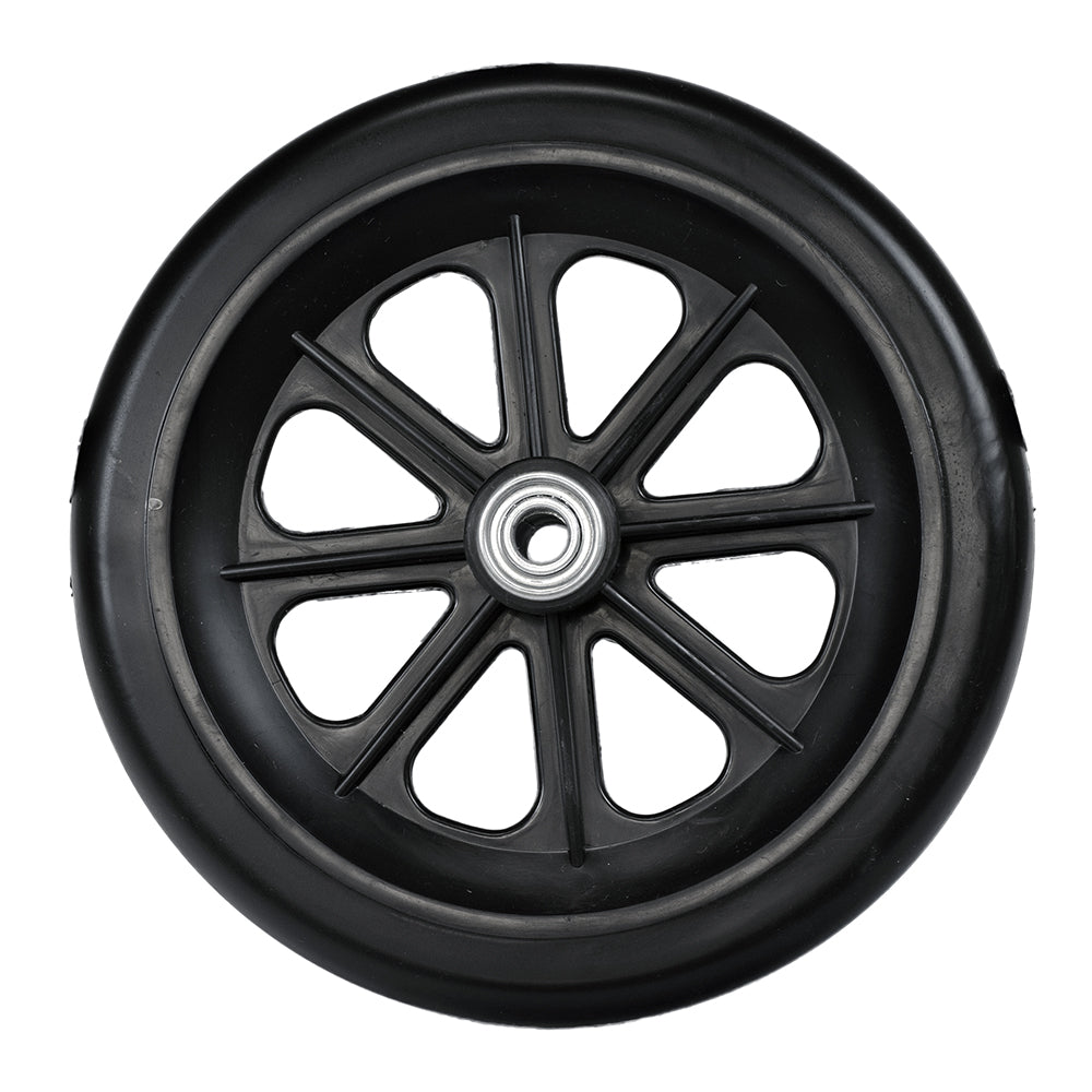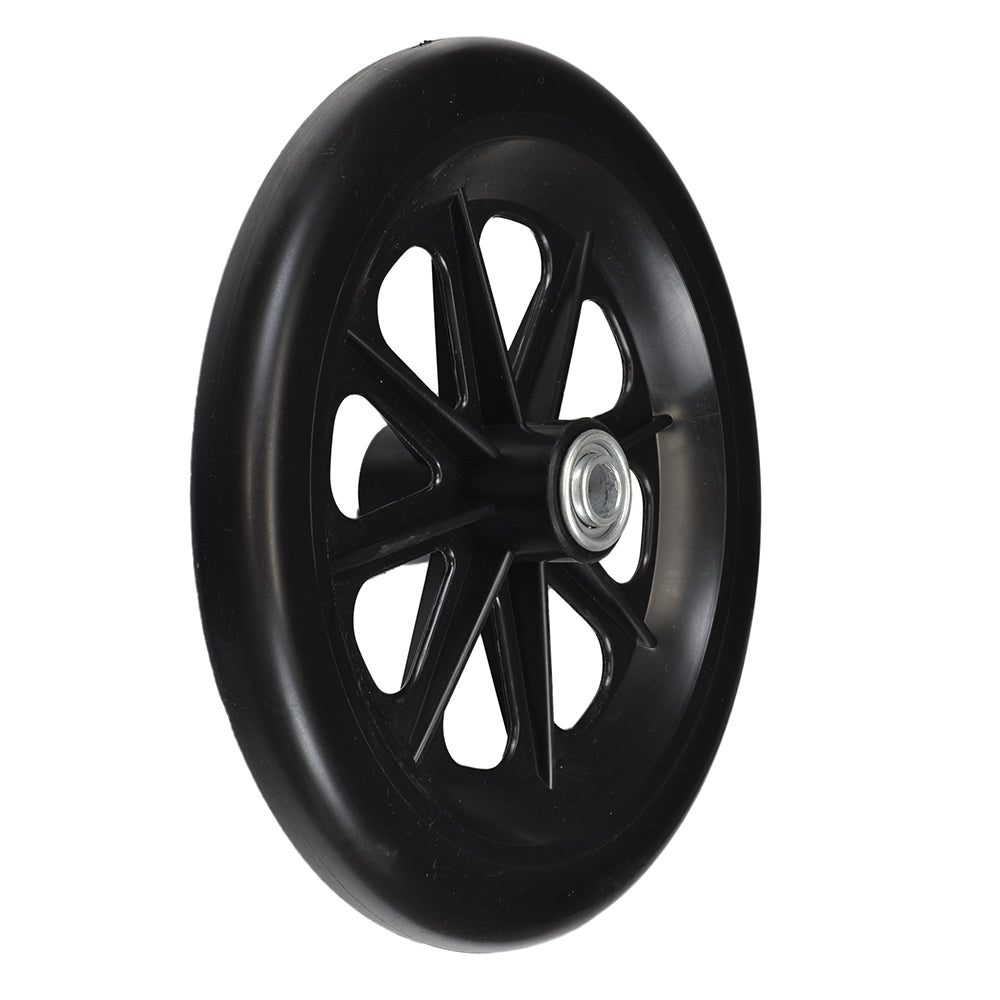 The 8"x1-1/4" front caster wheel for the Invacare Tracer EX2 and SX5 manual wheelchairs is a composite moulding made of solid dark gray rubber. The caster is complete with bearings.