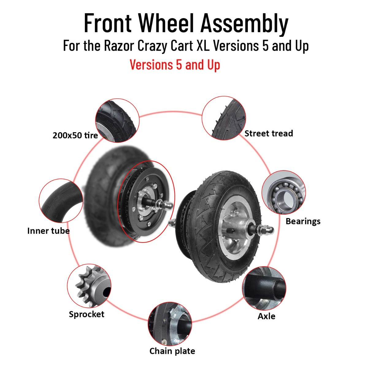 If you have a Razor Crazy Cart XL you already know what a superb electric go-kart it is. Now you can keep it rolling along with this complete front wheel assembly for the Razor Crazy Cart XL. The Crazy Cart XL is the largest of Razor's Crazy Cart line and this wheel assembly is made in either the Versions 1 - 4 or the Version 5+ You must select which version you need when placing your order. These versions use different chain sprockets and are not compatible with one another, nor are they compatible with the original Crazy Cart.