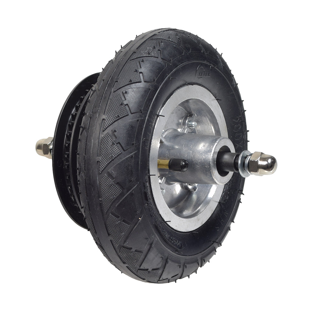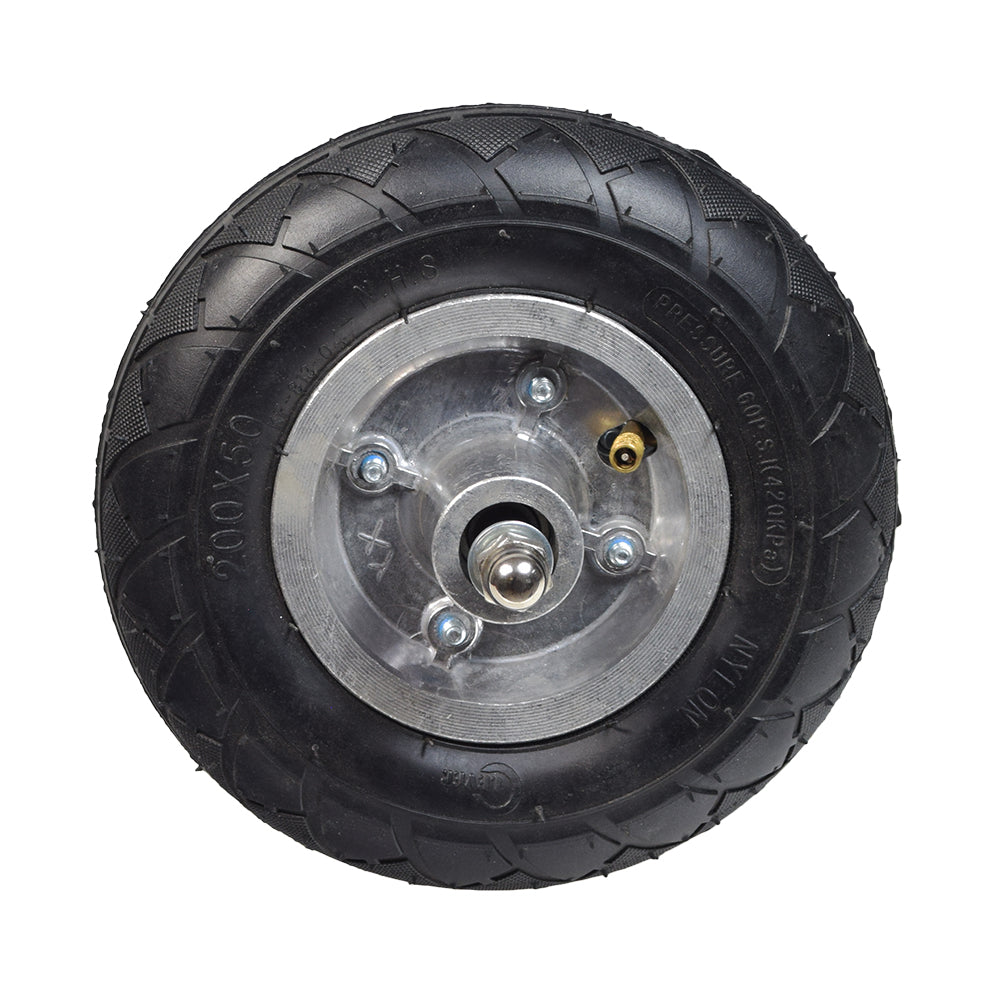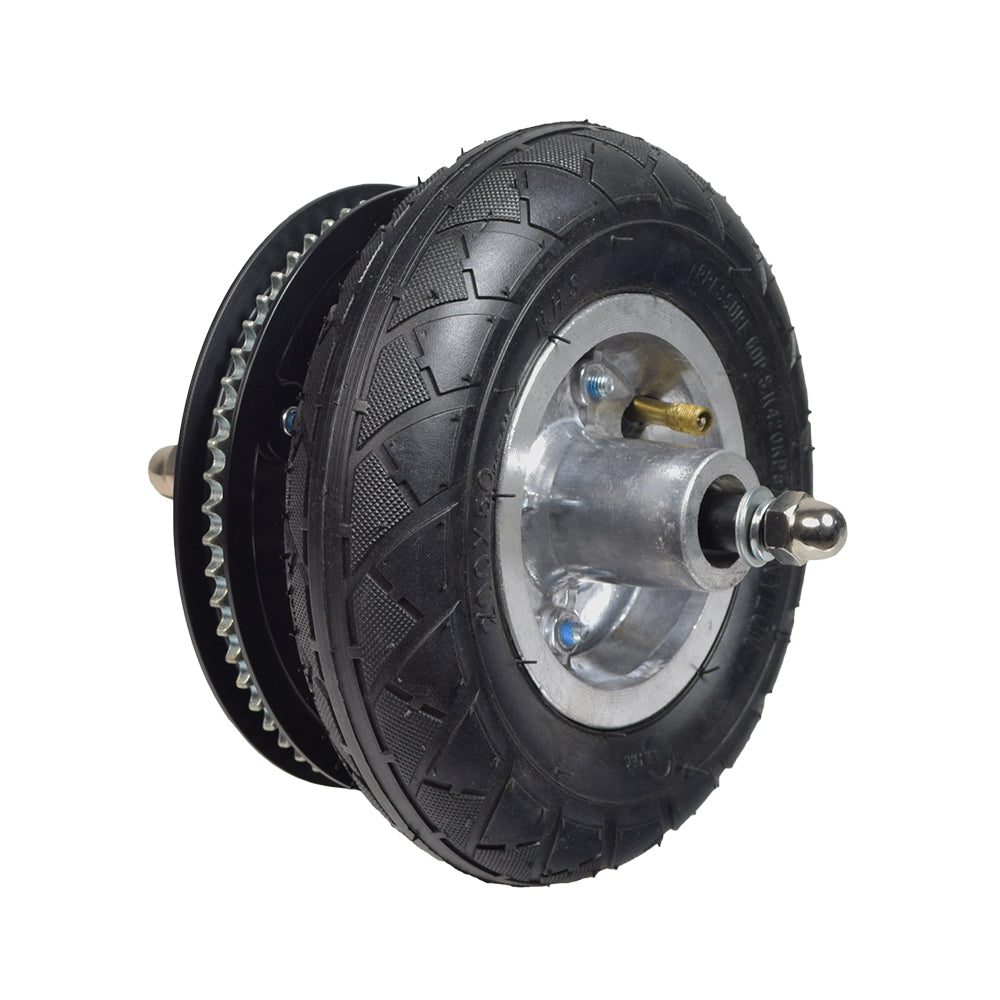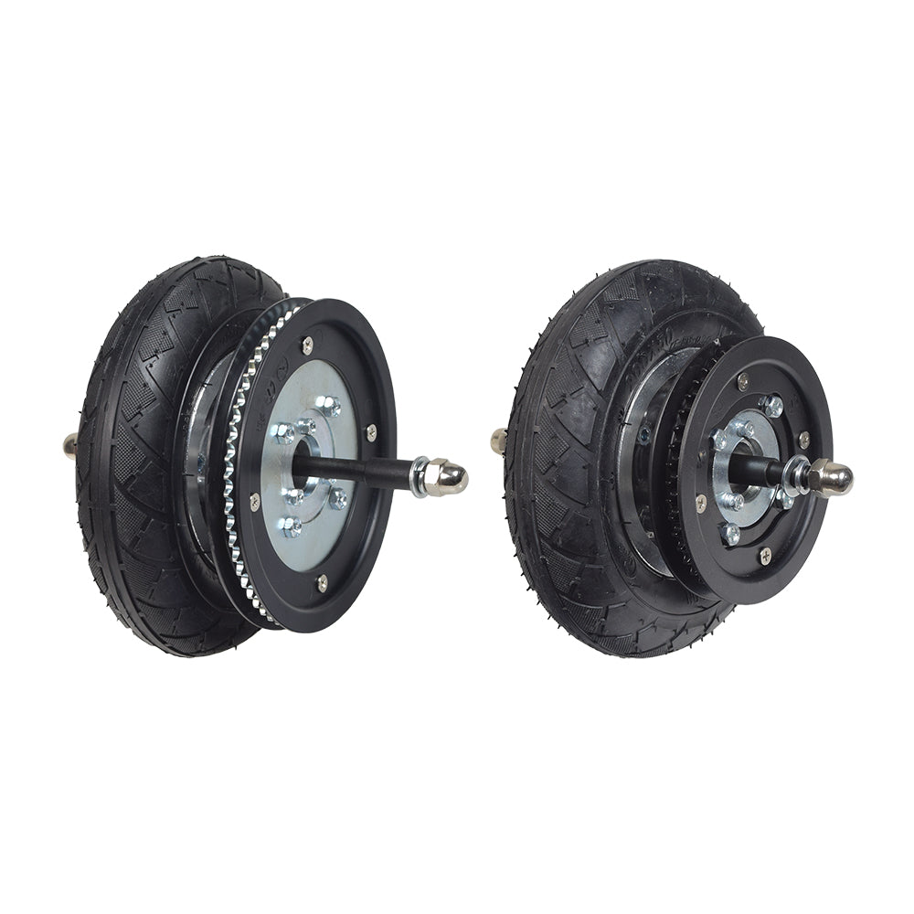 These are the complete front wheel assemblies. You get a 200x50 pneumatic tire, an inner tube with an angled valve stem, the hub, rim, chain plate, and sprocket, as well as the 9" axle rod and bearings.