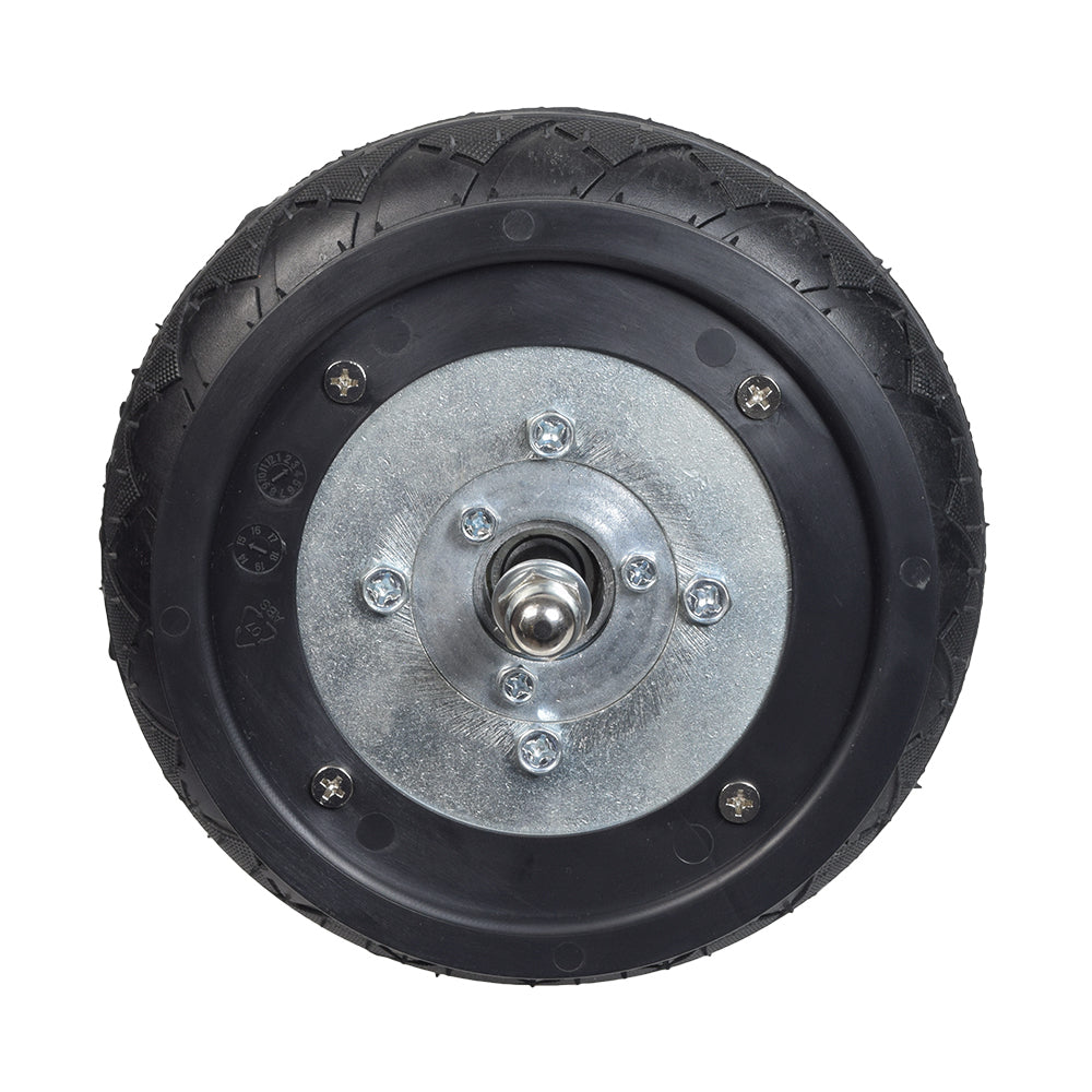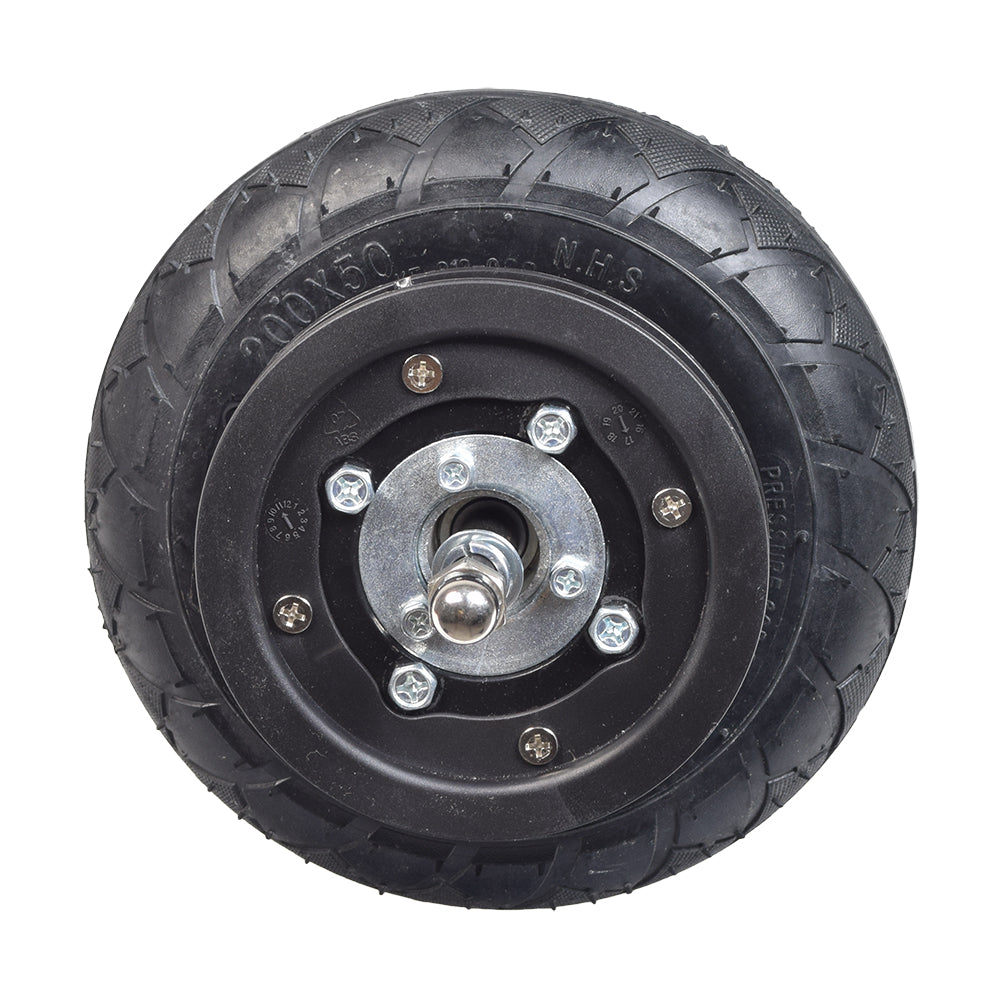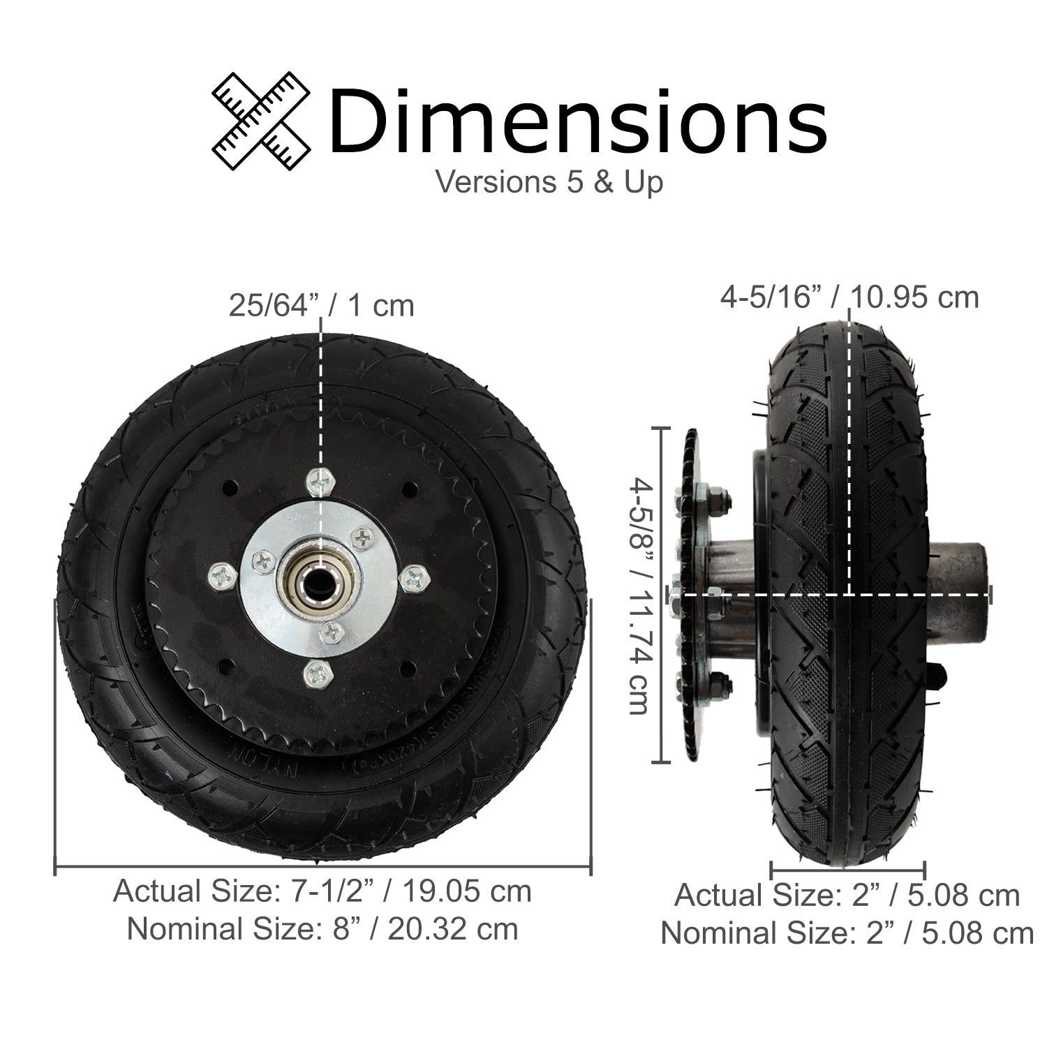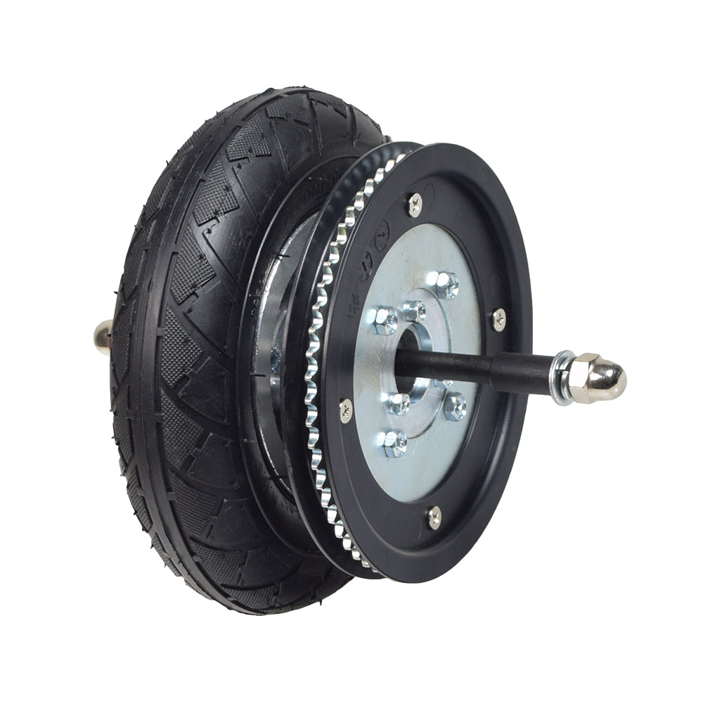 These are the complete front wheel assemblies. You get a 200x50 pneumatic tire, an inner tube with an angled valve stem, the hub, rim, chain plate, and sprocket, as well as the 9" axle rod and bearings.