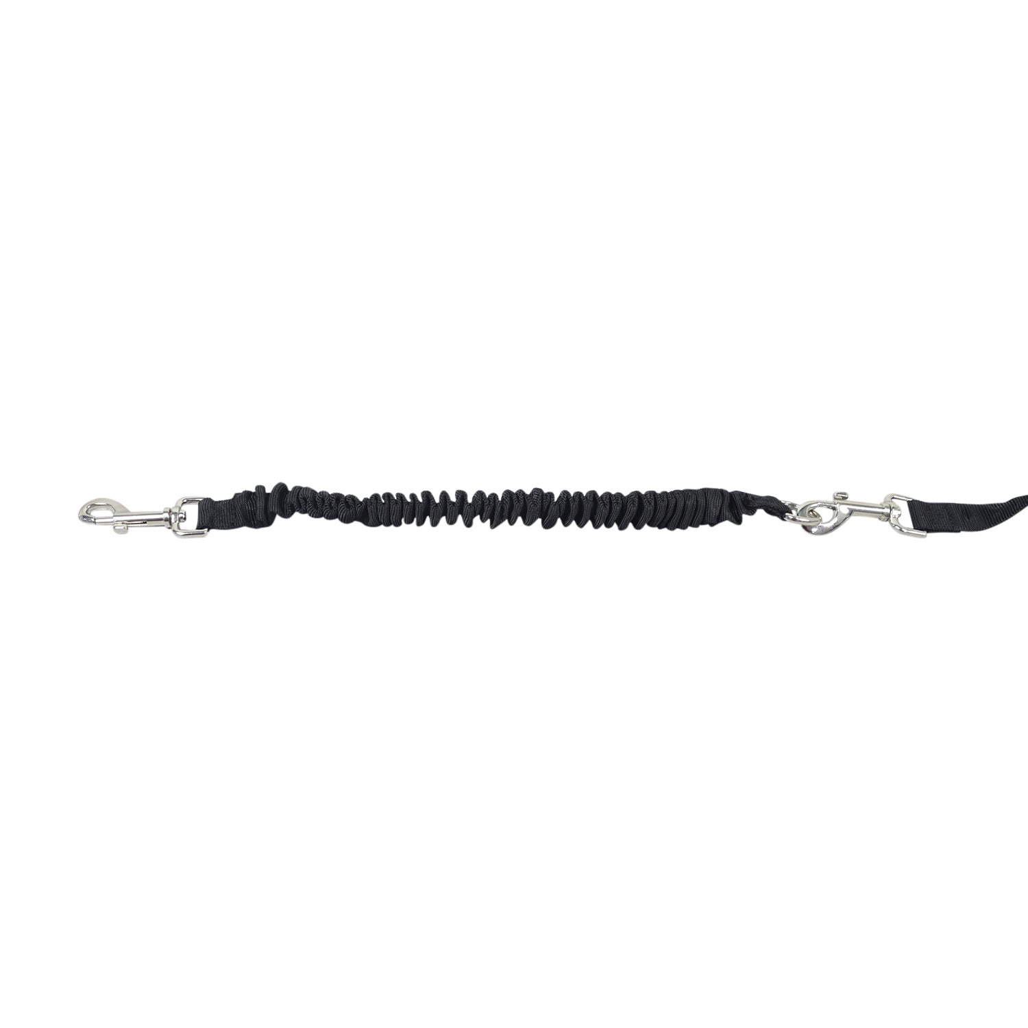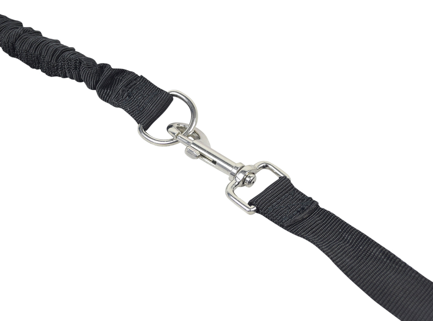 The secret is an easily installed clamp with a rubber insert that mounts under the saddle seat. The double clip leash has a rigid outrigger handle that you can even use as part of the leash when it is dismounted from the bike . The lanyard snap on the end can attach to the dog's collar or body harness.