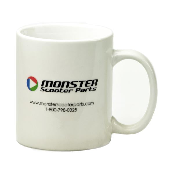 Here's a true collectible; a genuine Monster Scooter Parts ceramic mug from scooter times past. Made of white porcelain with the old-style Monster Scooter Parts logo, web address, and phone number on the side. As we have grown as a company, our corporate symbol has changed with the times. This logo represented us for a number of years but has now been consigned to the annals of Scooter History.
