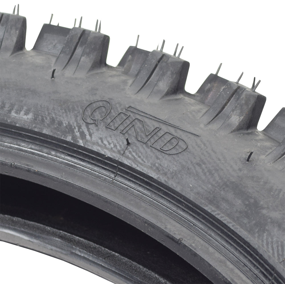 The Qind 90/100-16 dirt bike tire with QD015 knobby tread is the rubber you want on your off-roader's 16" rims. With the popularity of motocross riding, a tire with superior traction on loose surfaces is an absolute must-have dirt bike part. The beauty of this tire's design is the aggressive QD015 knobby tread; a pattern with thicker shoulder and tread blocks (aka "knobs") for extra grip when you take your bike off-road or out in the mud and the muck. These big knobs have enough free space between them to keep the mud and clay from clogging up the tread.
