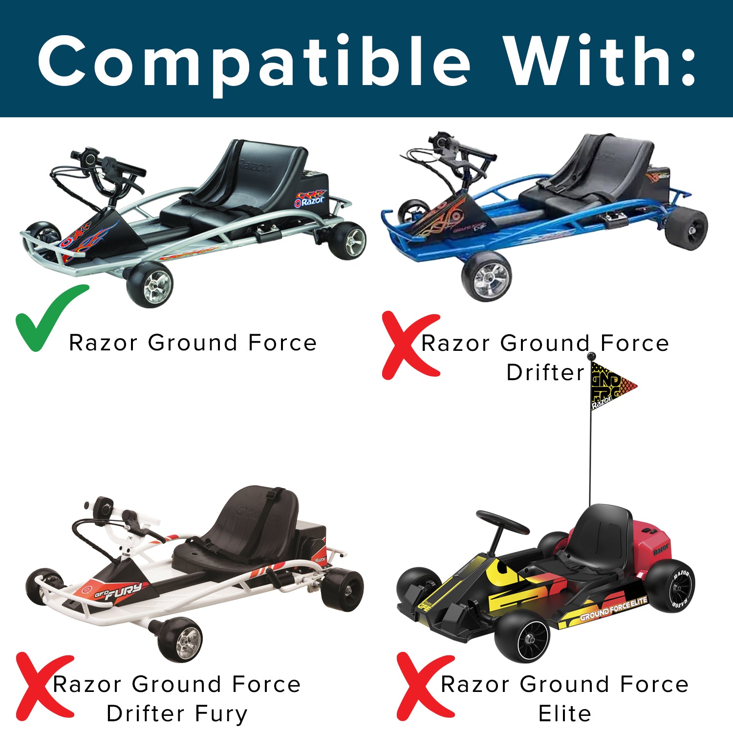 - Note - These wheels are NOT compatible with the Razor Ground Force Drifter, Razor Ground Force Drifter Fury, or the Razor Ground Force Elite