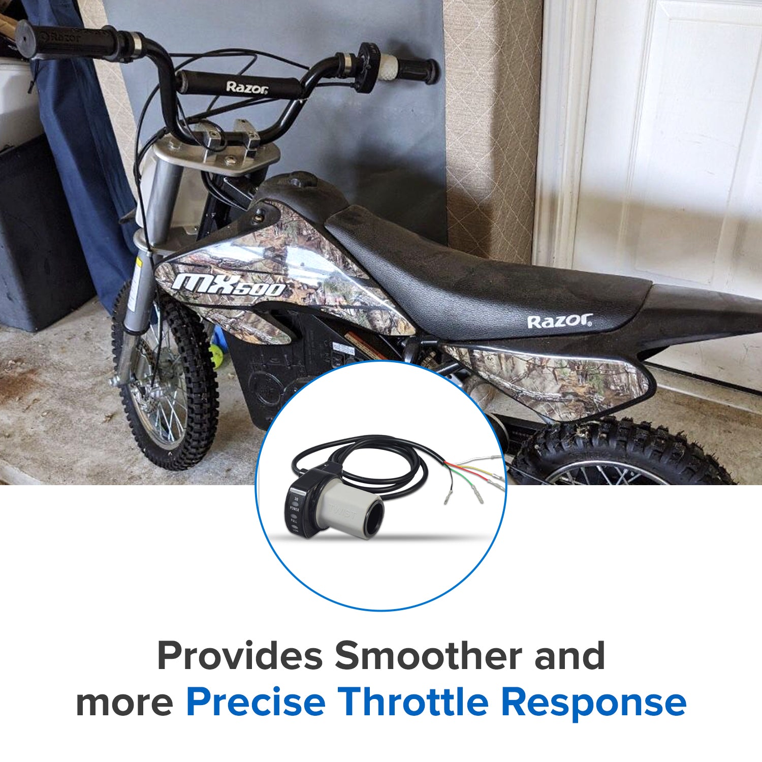 Replacement variable speed twist grip throttle for Razor MX500 Dirt Rocket (Versions 10+) and Razor MX650 Dirt Rocket (Versions 8+) scooters.