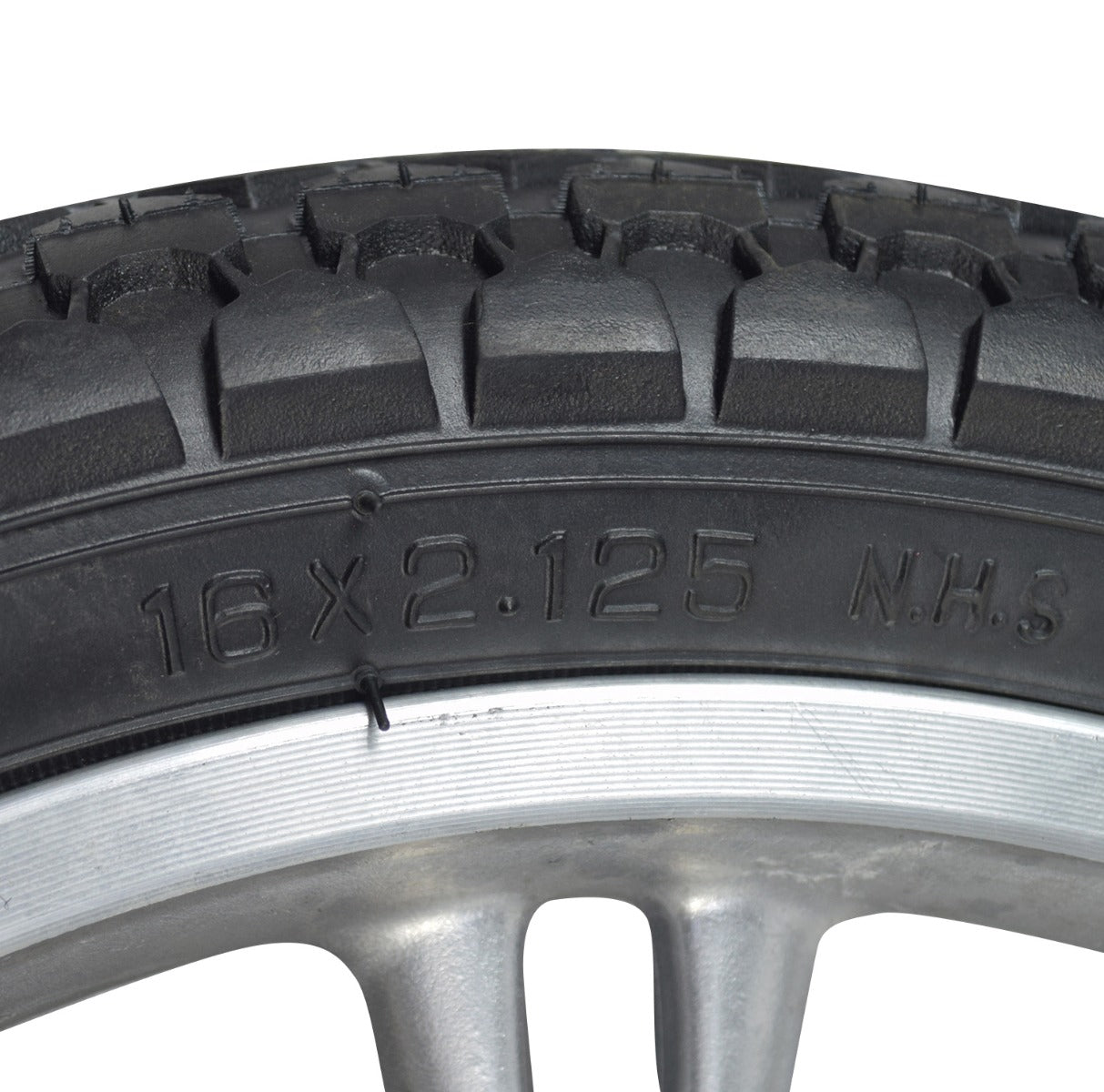 The rear wheel with a hub motor for Razor Ecosmart Metro HD, and Ecosmart Metro SUP electric scooters is an all-in-one assembly that combines the 350-watt, variable-speed, high-torque, brushless, rear-wheel hub-driven electric motor with a 16” (406 mm) pneumatic tire and an inner tube with an angled valve stem. In addition, this superb piece of modern e-bike design sports a silver-colored rim and an 80 mm band brake.