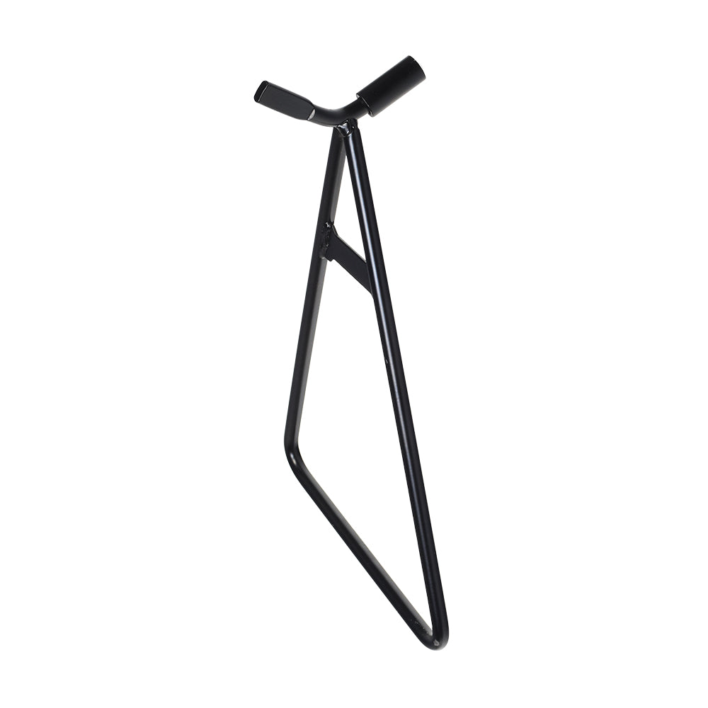 The beauty of this stand is in its simplicity; there are no moving parts, springs, or other distractions, only two lbs. of bent and welded steel. Strong as this handy stand is, it easily fits in your top case or in the under-saddle helmet box. In addition, when it's not holding up your bike or scooter, you can hang it from a porch rail and use it to call your kids to dinner.