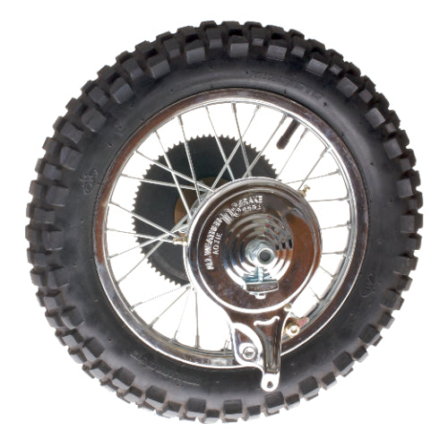 Minimoto XRF500 Dirt Bike rear wheel assembly. Comes complete with 15x2.5 tire, tube, chrome spoked rim, sprocket, 108mm band brake assembly, and bearings.